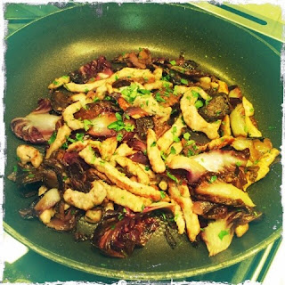 Mettere in una padella abbondante olio e far rosolare l'aglio, unire la carne precedentemente infarinata e cuocere pochi minuti a fuoco alto. Togliere la carne e versare nelle stessa padella i funghi e il radicchio (puliti e tagliati), cuocere pochi minuti e aggiungere quindi la carne.